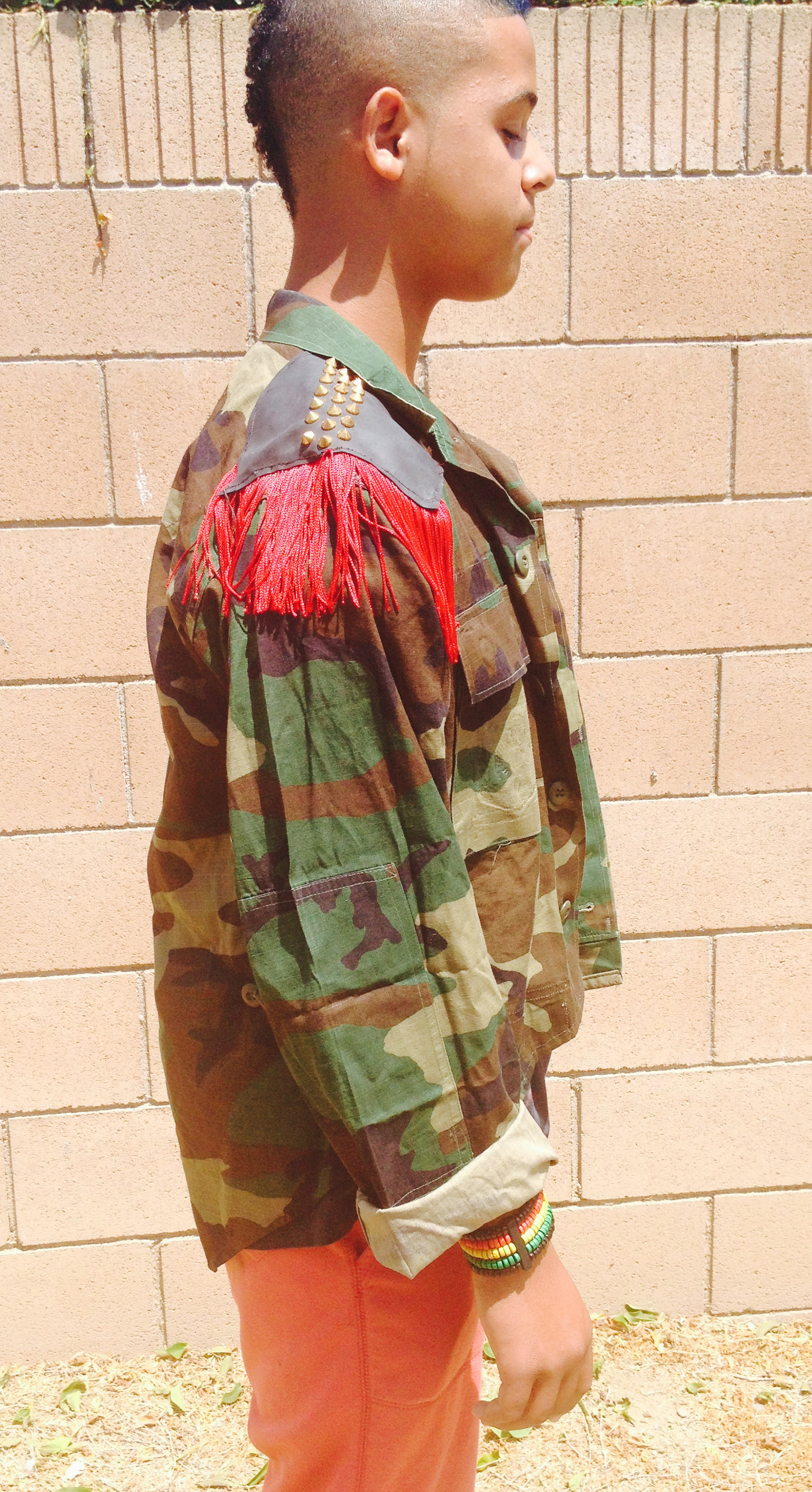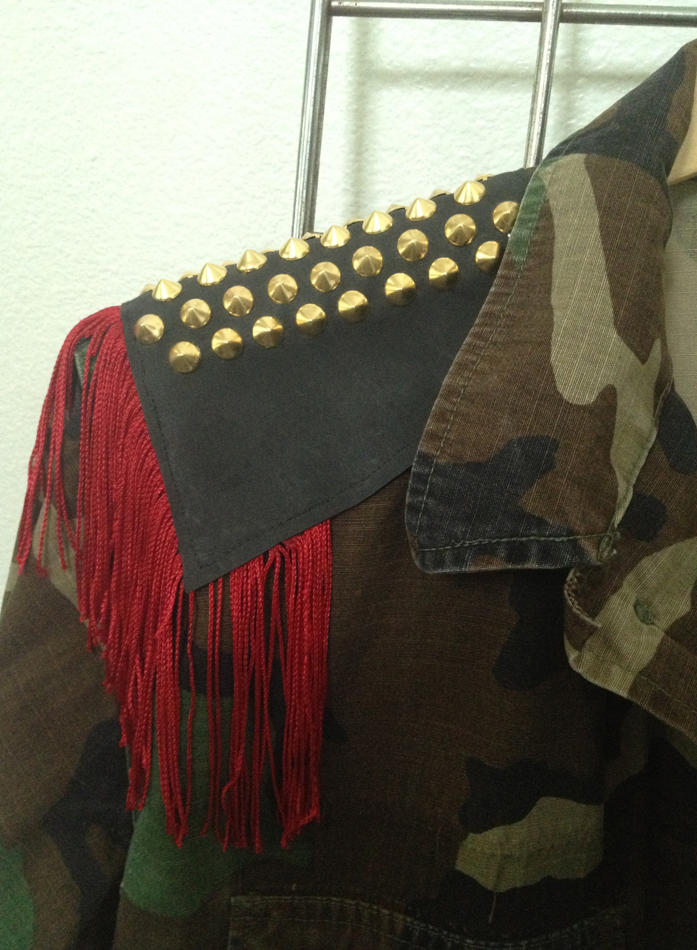 Red unisex custom military camouflage jacket with leather shoulder patches, fringe and gold pyramid studs.