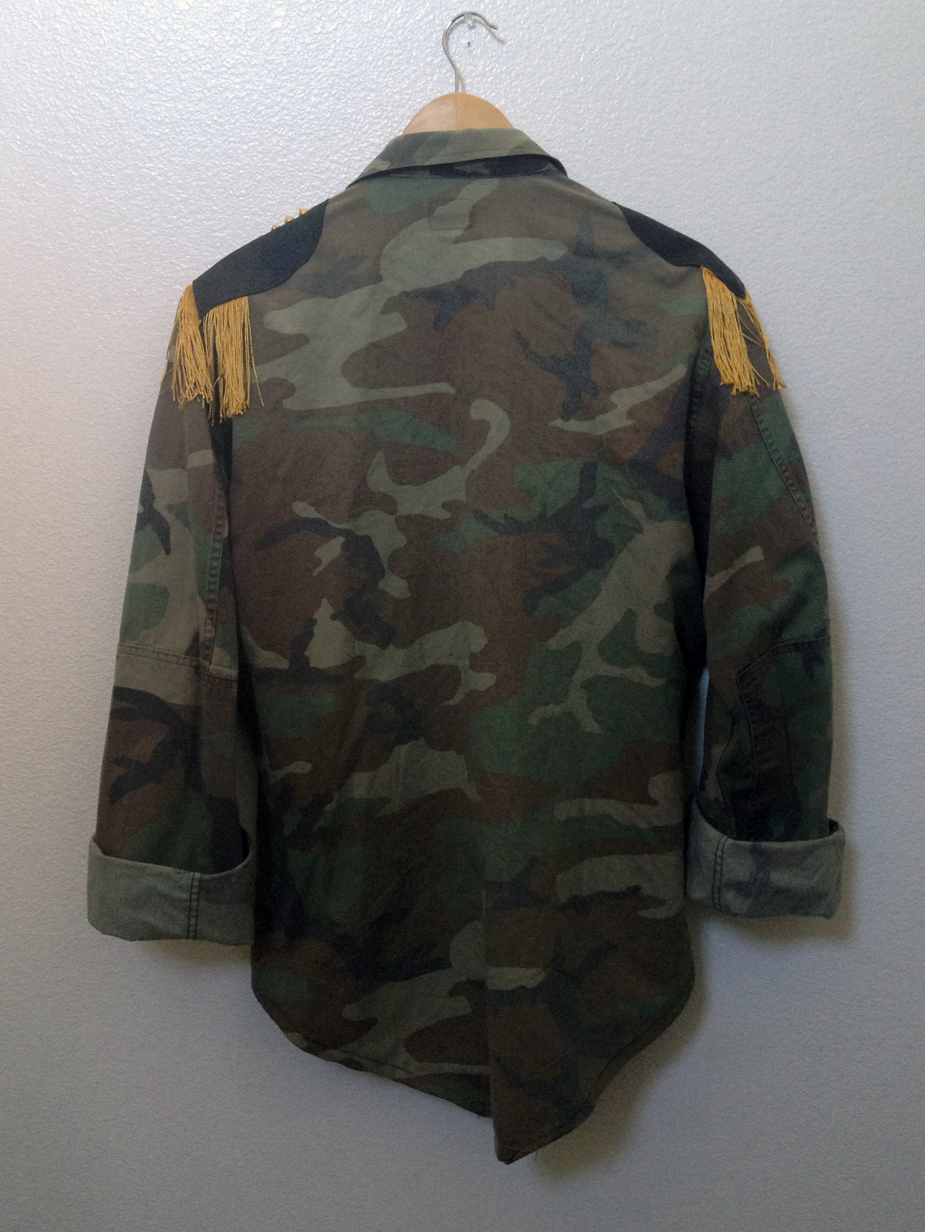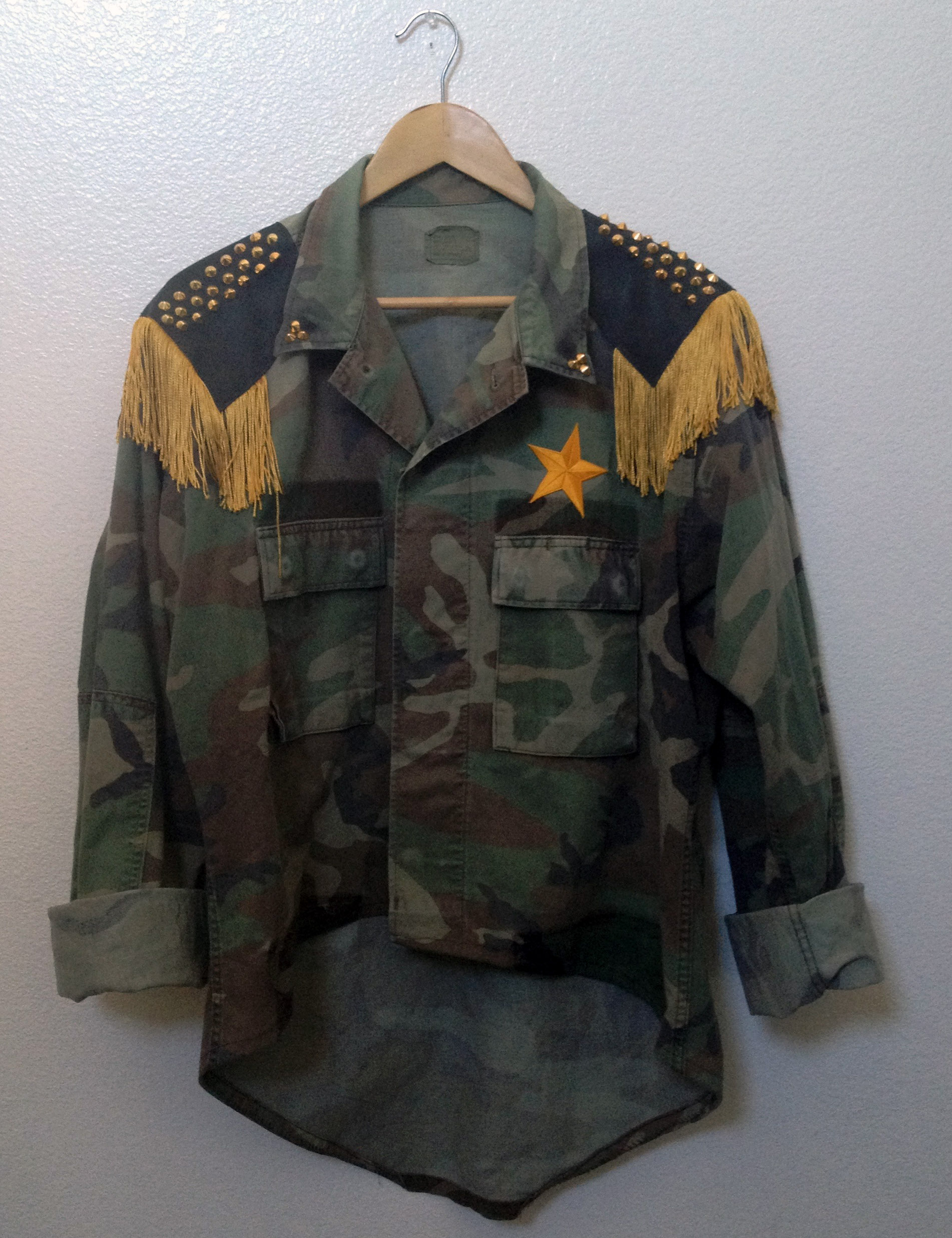 Mustard yellow custom military camouflage "HI-Low" jacket with leather shoulder patches, fringe and gold pyramid studs.