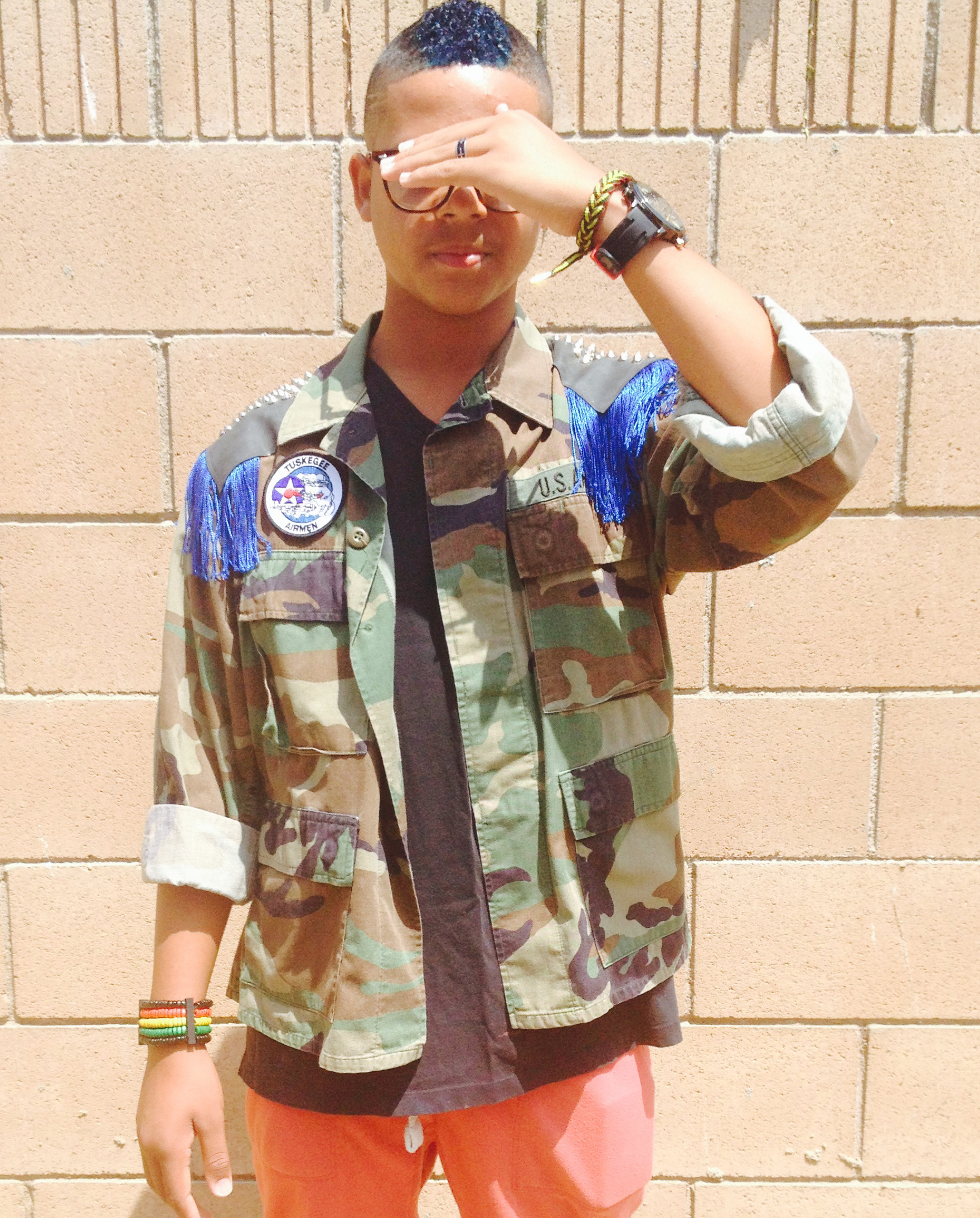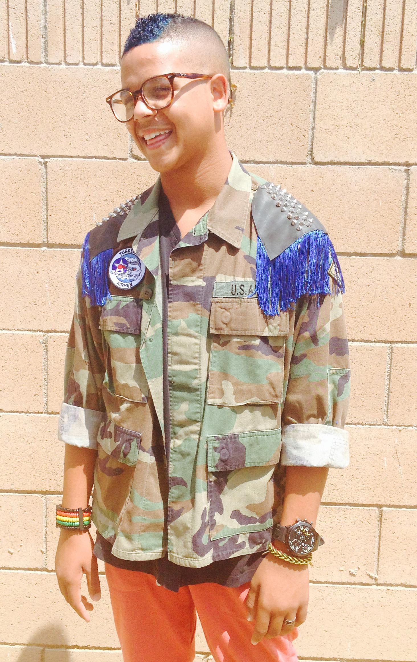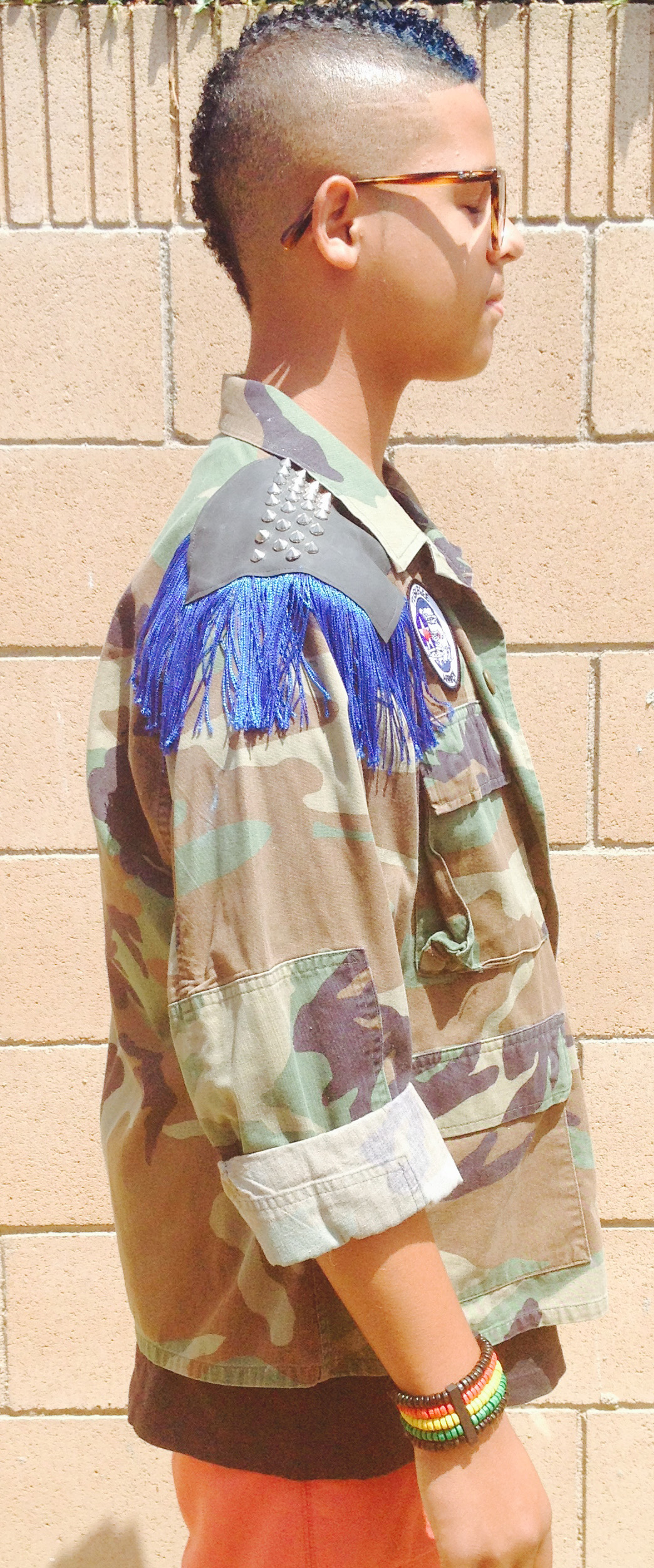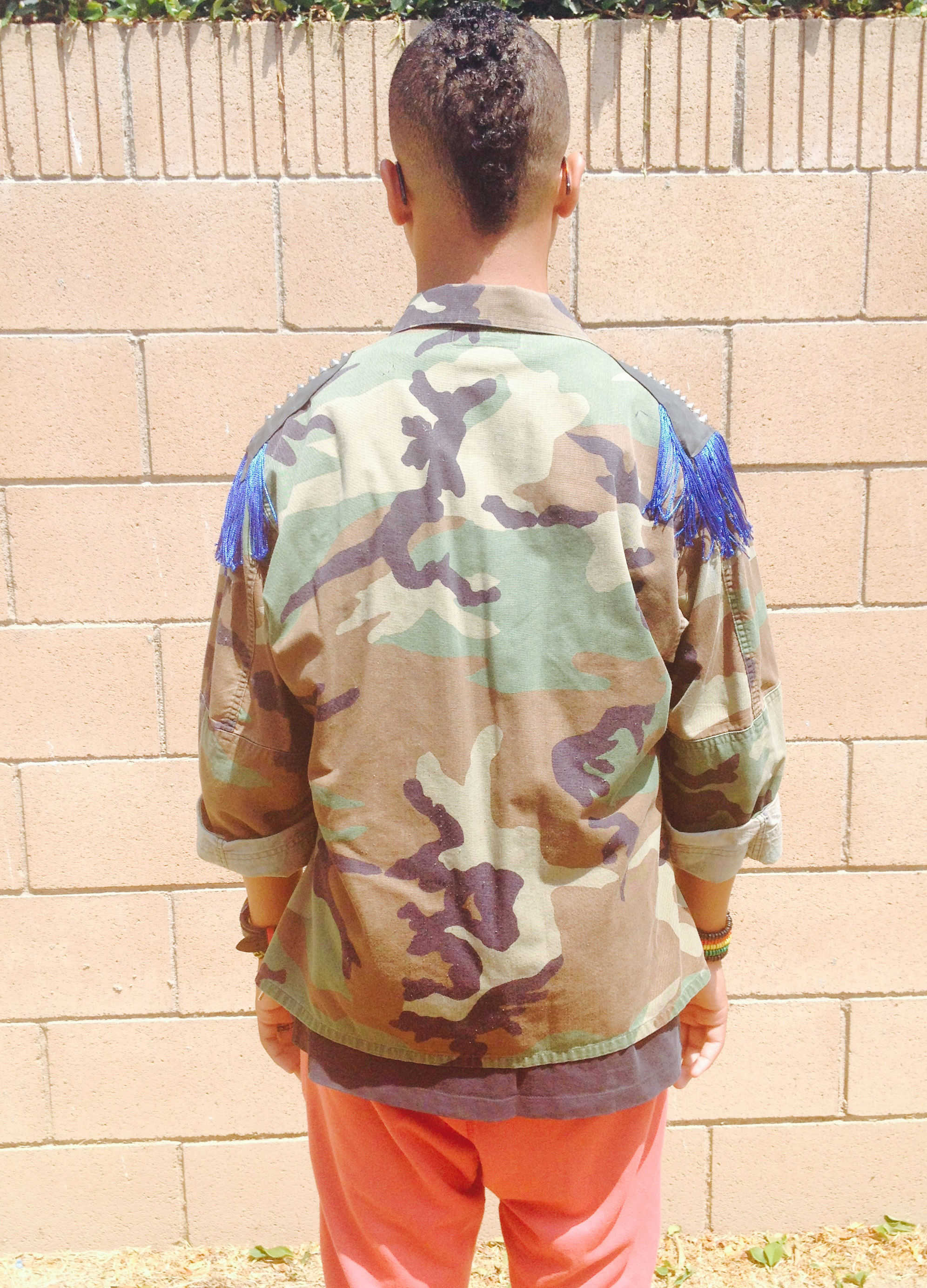 Royal blue unisex custom military camouflage jacket with leather shoulder patches, fringe and antique nickel pyramid studs.